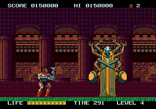 Essa é uma das principais diferenças que notei nos hack and slash que testei até agora no Mega. Ter a chance de bloquear um ataque em vez de apenas tentar esquivar dos inimigos que querem um pedaço de você muda toda a dinâmica. Eu sei que em Shinobi isso já era possível (talvez eu tenha descoberto tarde demais lá…), mas em Rastan eu usei e abusei desse mecanismo.
