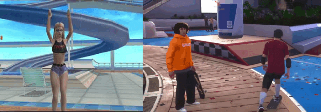 E no mapa do Cruzeiro, por mais idiota que a minha reclamação possa parecer, na versão original nós temos que impressionar as “gostosas” da Neversoft. Já na versão recriada, nós temos que impressionar os skatistas pro. Senti que rolou uma certa censura family friendly neste mapa e em outros do Pro Skater 4.